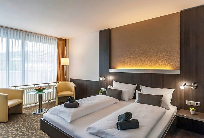 Sie erhalten ein Zimmer-Upgrade vom Doppelzimmer Klassik in die Kategorie Komfort. Die Doppelzimmer Klassik und die moderneren Doppelzimmer Komfort (ca. 28-30 m², min. 1/max. 2 Vollzahler + 1 Kind) bieten Bad oder Dusche, Föhn, Kaffee-/Tee-Zubereitungsmöglichkeit, Mini-Kühlschrank, Sitzecke, Schreibtisch und TV.